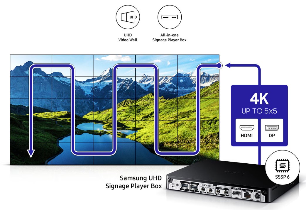 Utilizing daisy chain design through DisplayPort 1.2 or HDMI ports enables Samsung video wall displays to present UHD content on multiple screens without an external graphic card. Samsung's UHD Signage Player Box streamlines functionality by combining the media player and content management software.